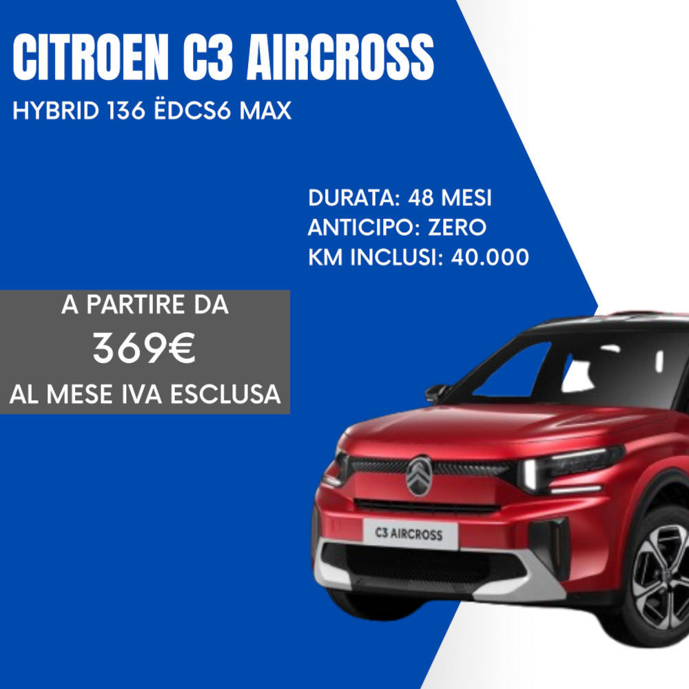 SUV mild‑hybrid da 136 CV che unisce efficienza e versatilità: la C3 Aircross Hybrid 136 ëDCS6 MAX offre cambio automatico a 6 rapporti, consumi contenuti e silenziosità in città. Con un bagagliaio da circa 460 l (espandibile fino a 1.600 l) e interni progettati per il comfort, è perfetta per famiglie. La trazione anteriore, l’omologazione Euro 6d e la struttura da SUV compatto la rendono una scelta sicura, moderna e adatta a ogni tipo di guida urbana e fuori porta.